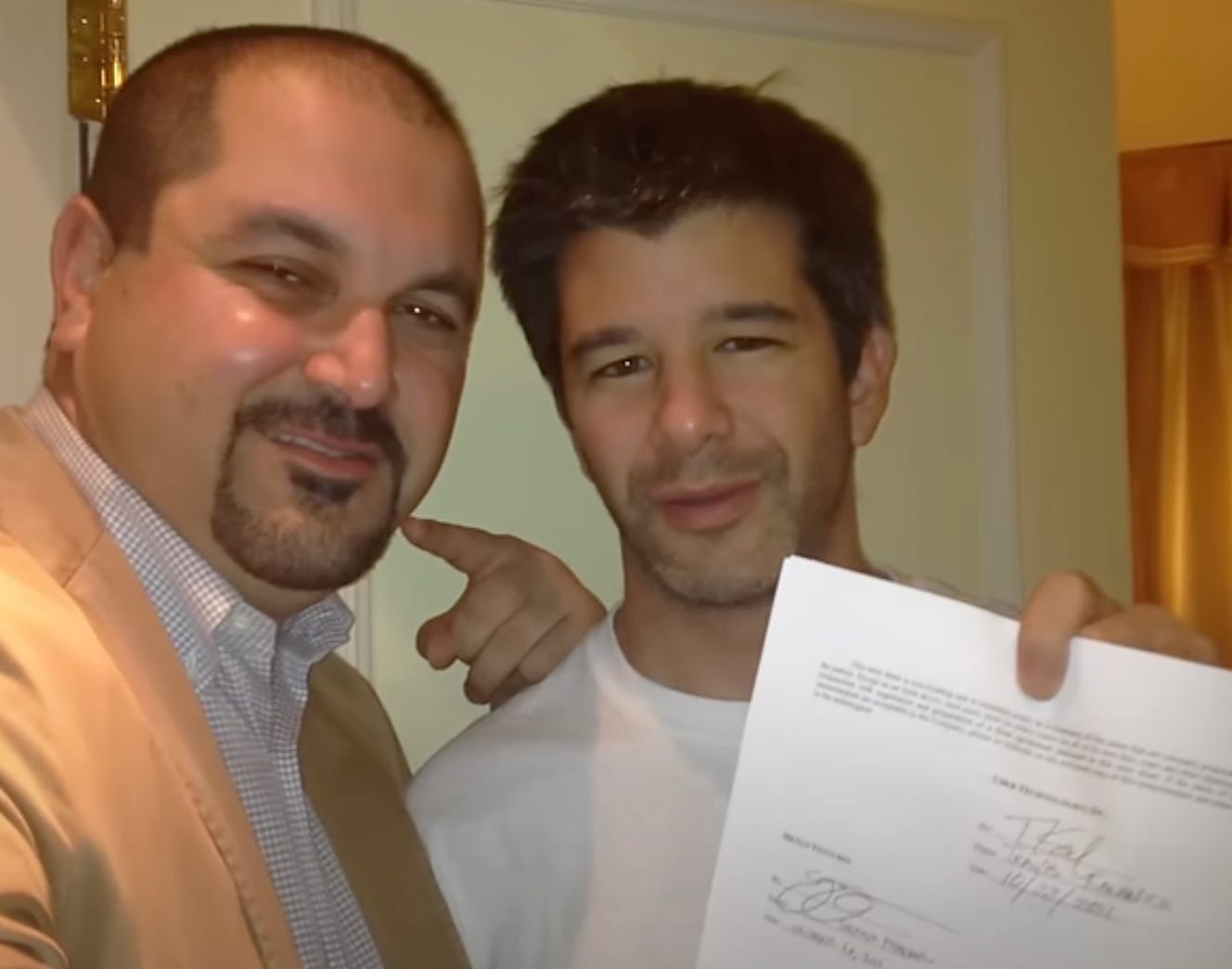 Shervin ran to Travis’s hotel room, Travis signed the term sheet, and they took a picture to celebrate.