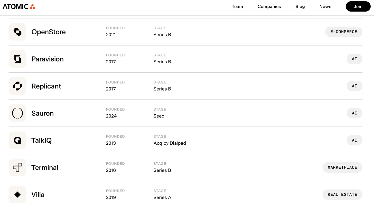 You can search for their fund announcements and Techcrunch will tell you how much they raised recently. Or you can look up their team roster and see that Jack Abraham is the founder and CEO, Chester Ng is a general partner, and Kristin Schaefer, a former Postmates CFO, is their most recent general partner hire. You can even go on their website and look at a couple of companies that they’ve invested in - or, more appropriately, built, or even more specifically, conceptualized… perhaps there’s no word in the English language to precisely describe what Atomic does. But if you put your reading glasses on, you’ll quickly realize that the companies listed on Atomic’s site are outdated; the fund only lists companies they’ve backed in the past that were successful. 15 out of the 17 companies listed were founded between 2012 and 2021, and the two other companies were founded in 2024.