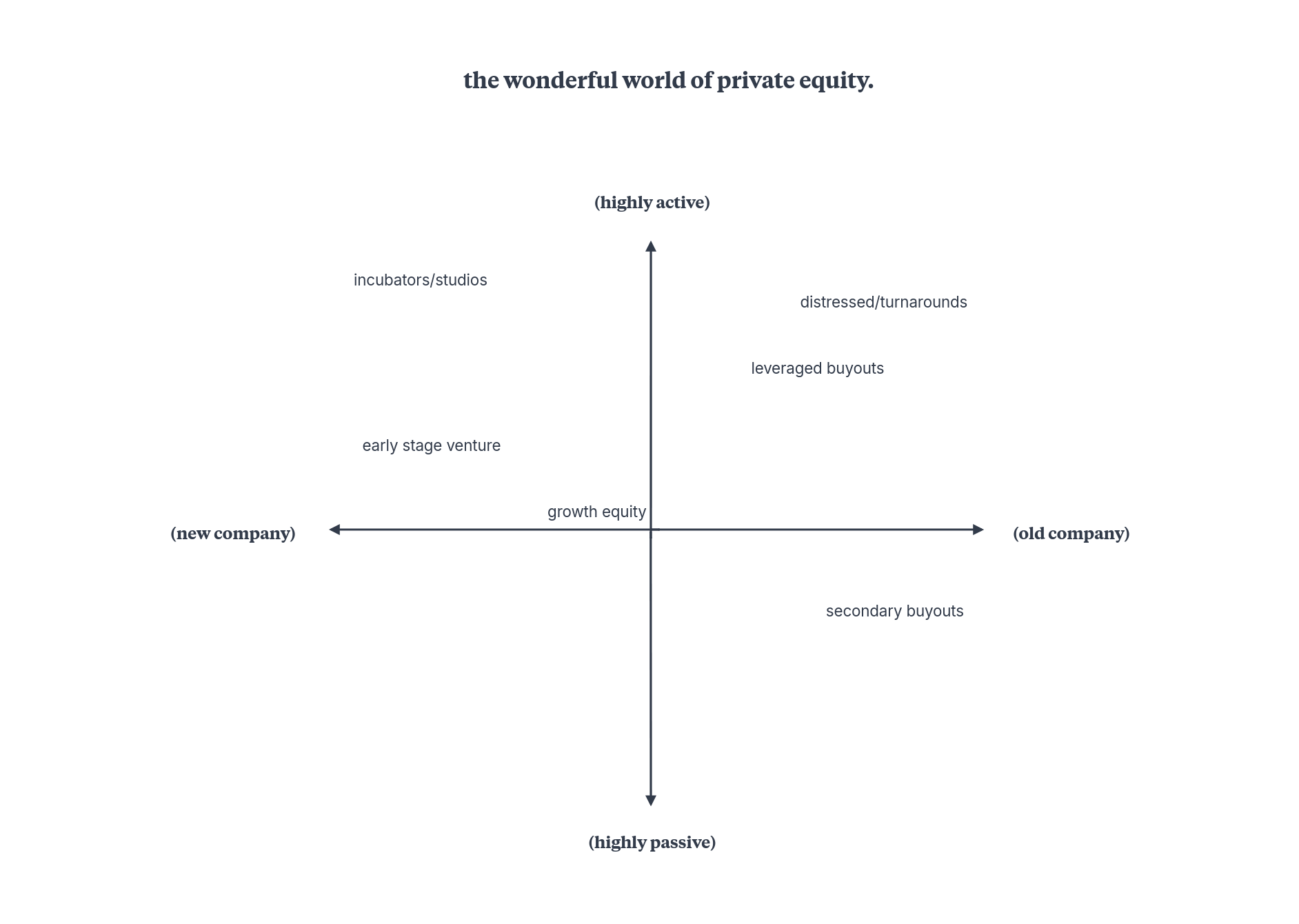 While leveraged buyouts get all the “private equity” media attention, early stage venture and growth equity get all the “venture capital” media attention, and less covered strategies such as incubators, distressed private equity, and secondary buyouts sit in the shadows of their famous family members. Everyone knows Stephen Schwarzmann from Blackstone, Henry Kravis from KKR, Josh Harris from Apollo, Orlando Bravo from Thoma Bravo. Likewise, Marc Andreessen and Peter Thiel have become household names. But the average business savvy American cannot name a single high profile investor who founded a venture studio, distressed private equity firm, or secondary buyout firm. There are a few ways to explain why there’s a lack of attention on these lesser known private equity sub-sectors.