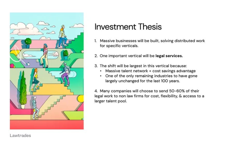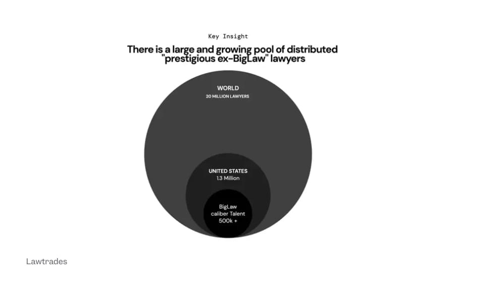 Constraints on the supply of ex-Big Law lawyers is an obvious barrier to the outlier outcome Lawtrades’ constitituents are searching for. After proving product-market-fit with legal professionals, the next step is to expand to other segments of knowledge work.