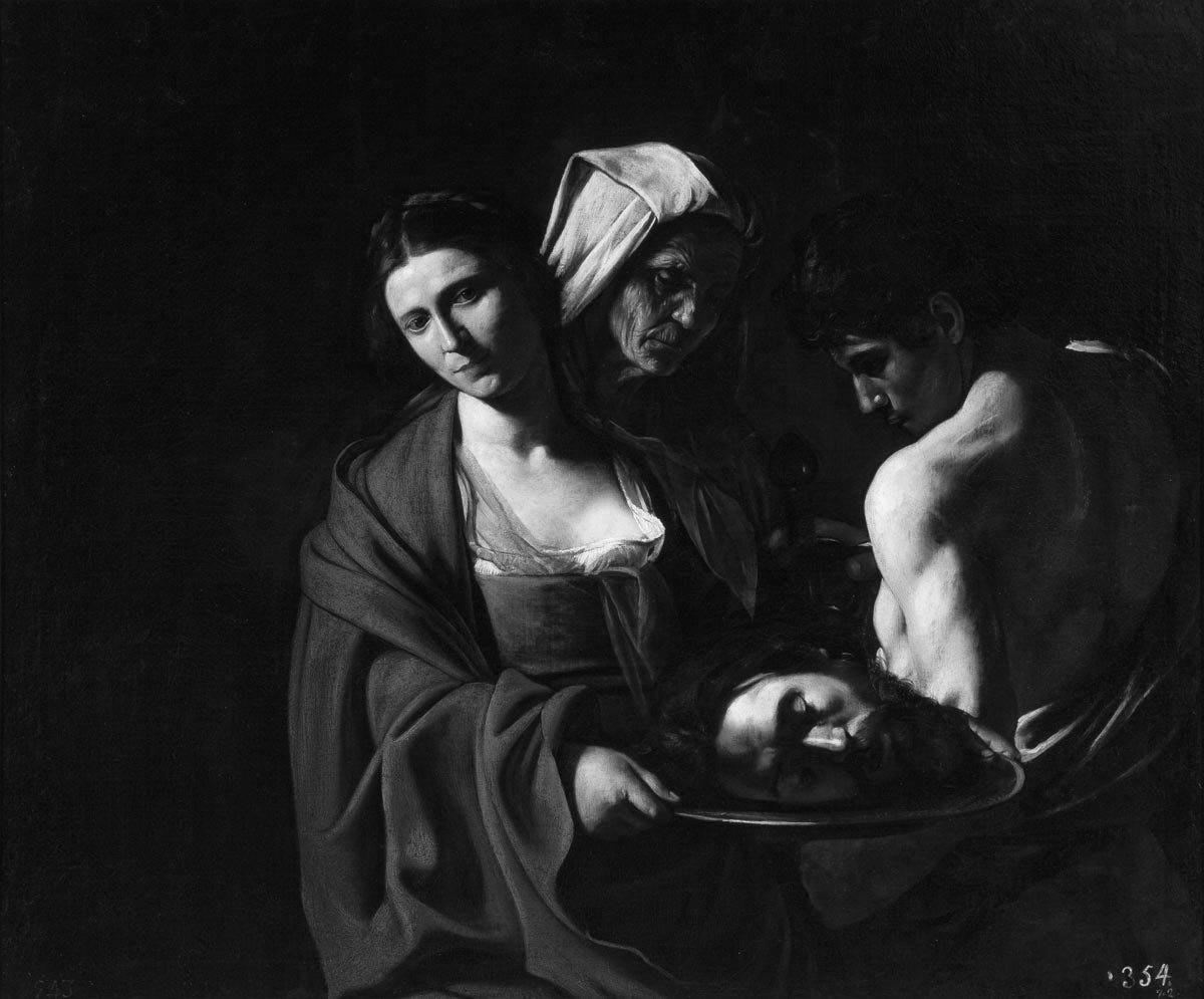 He spent the next four years in exile, bouncing between Naples, Malta, and Sicily. During this time, Caravaggio’s remorse began to leak onto his canvas. He painted a number of works revolving around the themes of beheading, Christian mercy, and forgiveness, including The Beheading of Saint John, The Seven Works of Mercy, The Raising of Lazarus, and Salome with the Head of John the Baptist.