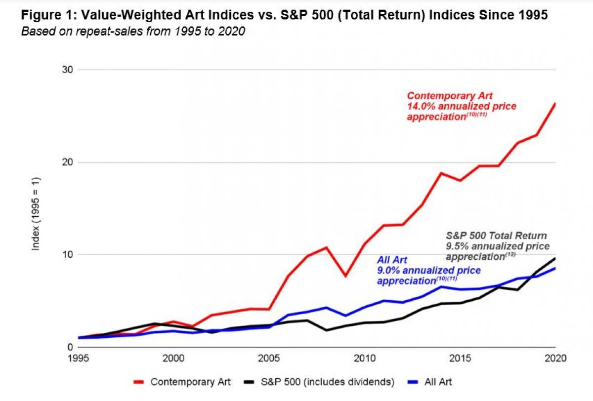 Contemporary art has outperformed the S&P 500 at a compound annual growth rate of 12.6% between 1955 and 2022. Online platforms and digital art are now complementing the expansion of art as an alternative asset.