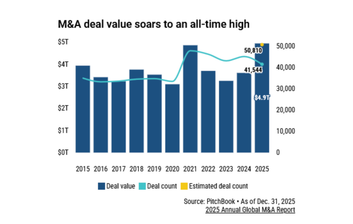In 2025, there was a strong rebound in M&A, reaching a deal value of just under $5T, thanks in large part to the record level activity in Q3 and Q4. Mega transactions–exceeding $5B–saw a notable uptick, with 122 occurring, a sharp uptick from the 76 and 74 in 2024 and 2023 respectively. Strategic buyers through corporate M&A rose to $2.73T, representing roughly 60% of total deal value.