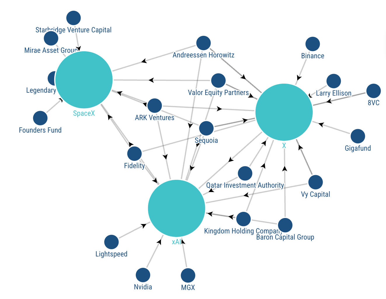 Arguably the two most notable VCs in Sequoia and a16z both see their private Elon holdings consolidated into one entity after investing in all three ventures at previous stages. Other notable mentions include Founders Fund investing in SpaceX, Larry Ellison’s and Qatar’s stake in X, and Lightspeed and Nvidia backing xAI.