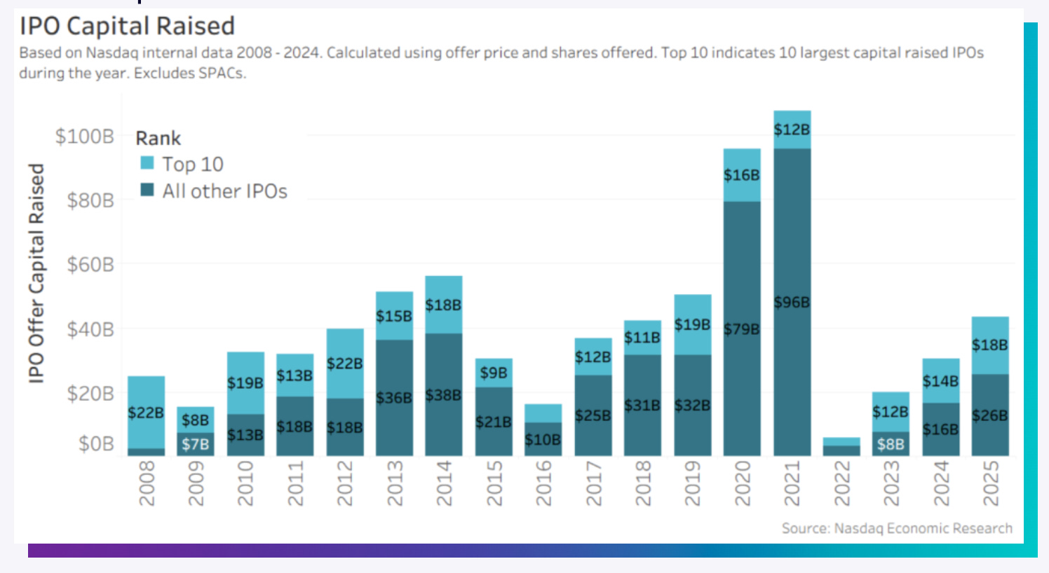 The IPO market also improved from the past few years, as the 354 total new public offerings far surpassed the 218 and 145 in 2024 and 2023 respectively. $44B was raised by non-SPAC offerings, compared with $30B and $20B in the two previous years, with healthcare company Medline winning the gold medal after raising $6.26B in their IPO. Although the capital raised through public markets in 2025 don’t come close to 2021 figures, it was still significant enough to surpass every year between 2015 and 2018.
