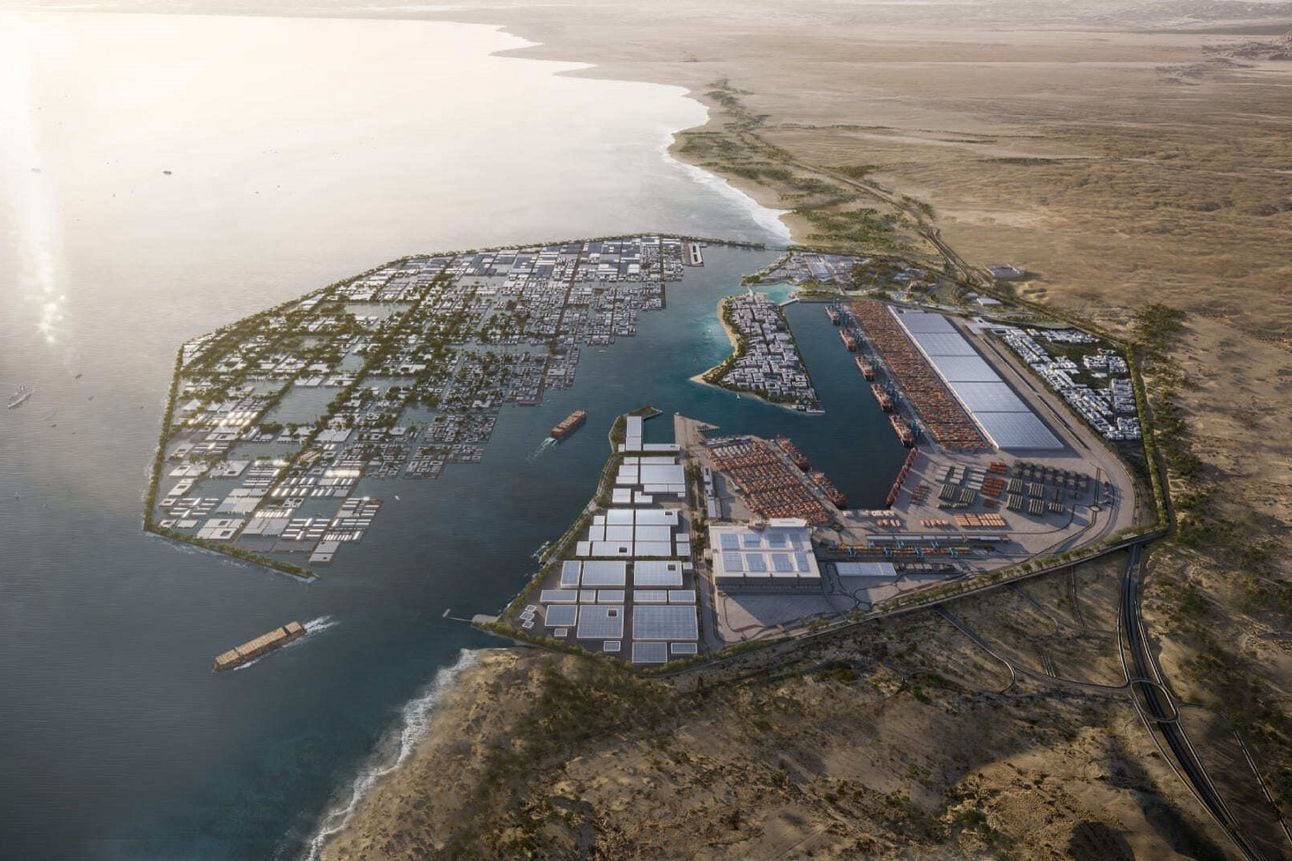 a futuristic city 30X the size of New York City, located on the coastline of the Red Sea