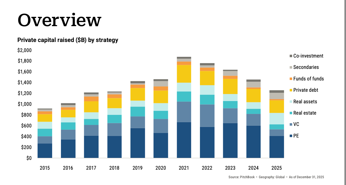 As the data shows, private capital raised across the board has seen a downward trend since the 2021 peak, with venture capital and private equity following the trend. Not only has the total amount raised between the two assets decreased, but their share of capital within the private ecosystem has decreased as well, as LPs have shifted to assets like infrastructure, secondaries, and private debt, given the lack of cash flow PE and VC has provided recently. PE specifically has seen fundraising decrease to $414.2B in 2025, a 38% decline from the 2021 peak. In VC, the biggest players increased their share of capital raised, as 22% of commitments were closed by 10 funds, the highest since 2012.