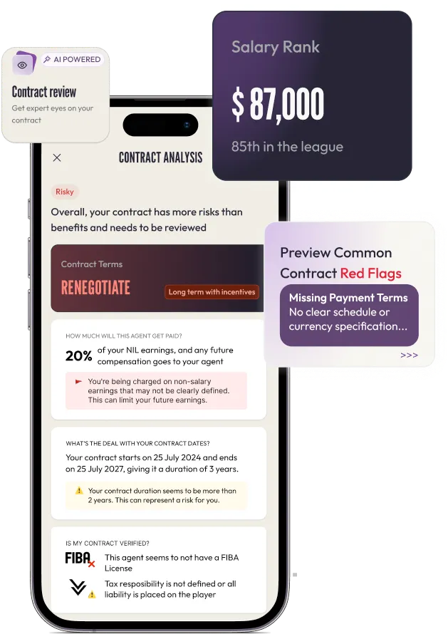 Athletes upload contracts. Compare salaries. Review agents and teams. Rate housing, payment reliability, contract terms.