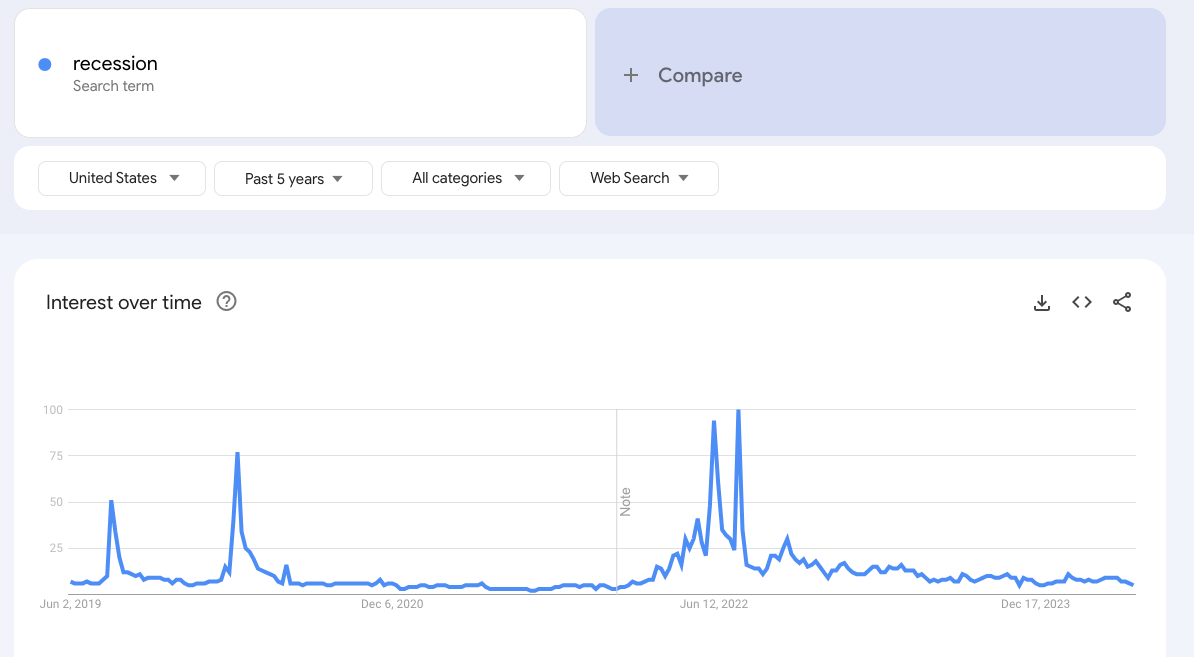 According to Google Trends, search queries for “recession” peaked during the summer of 2022.