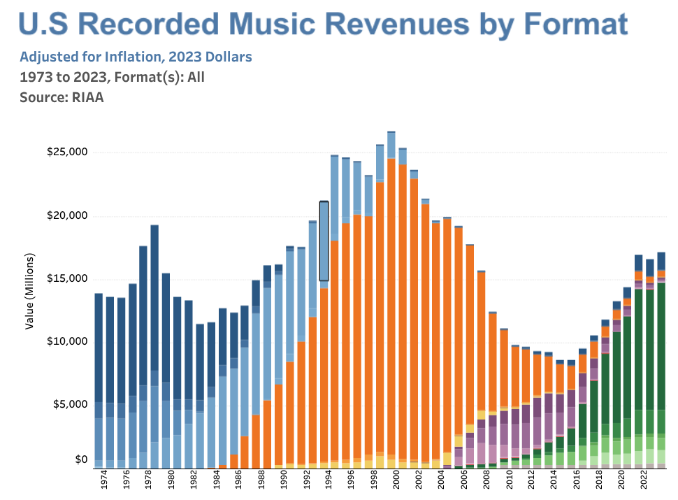 Music revenue hit a crescendo in 1999, when CDs were in its prime.
