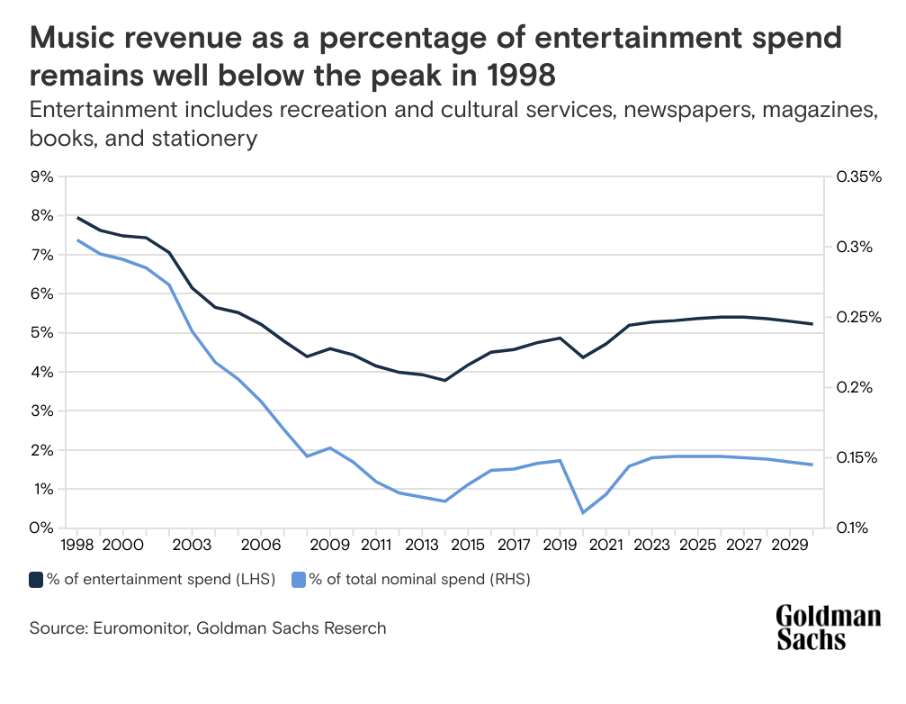 According to Goldman Sachs, music revenue as a percentage of entertainment spend has been declining since the late 1990’s.