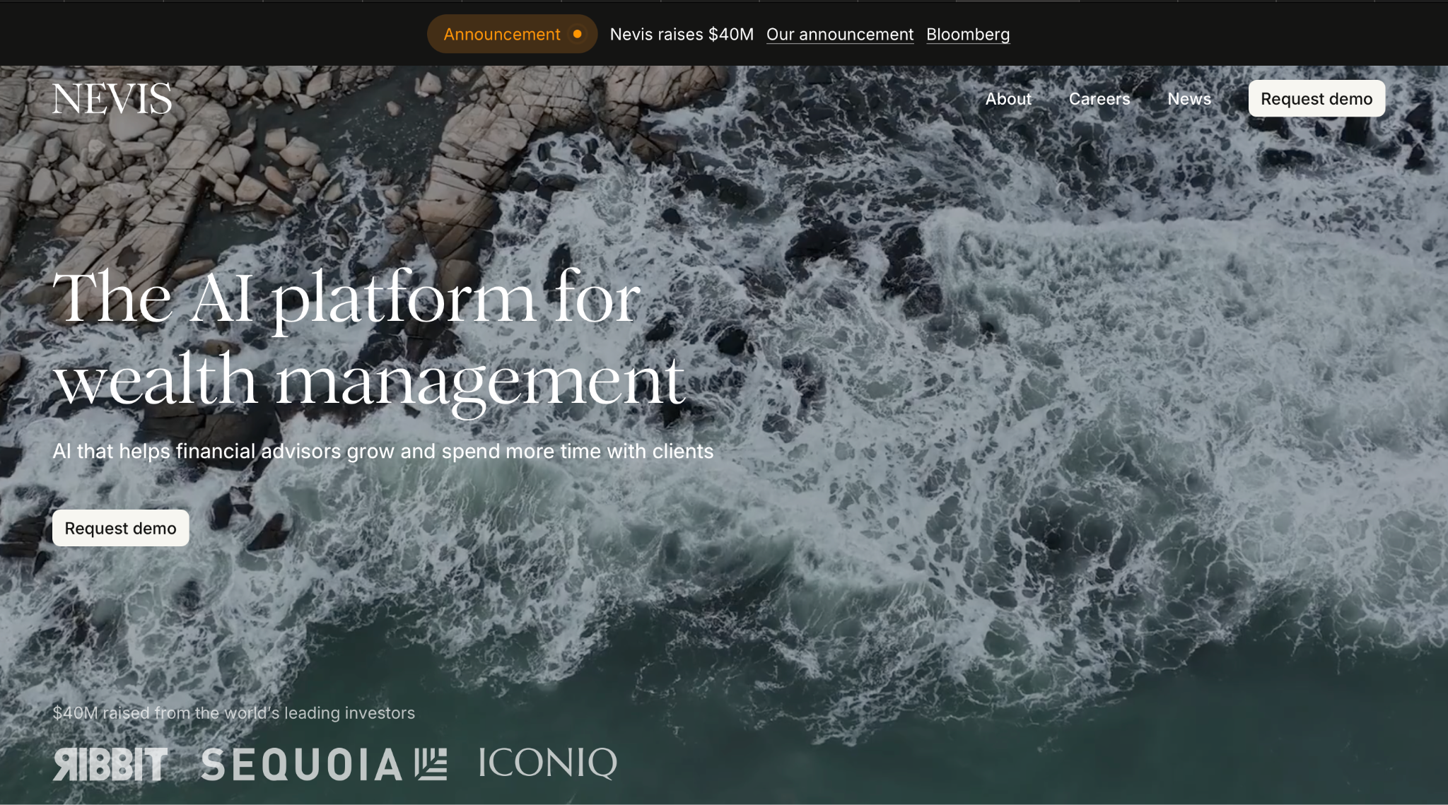 Company Overview: Nevis is a unified AI platform for wealth management. They help advisors complete operational work end to end, including meeting preparation, client follow-ups, account openings, and ongoing service. Nevis supports advisors that manage more than $50B in assets. The company raised a $35M Series A from Ribbit, Sequoia, and Iconiq.
