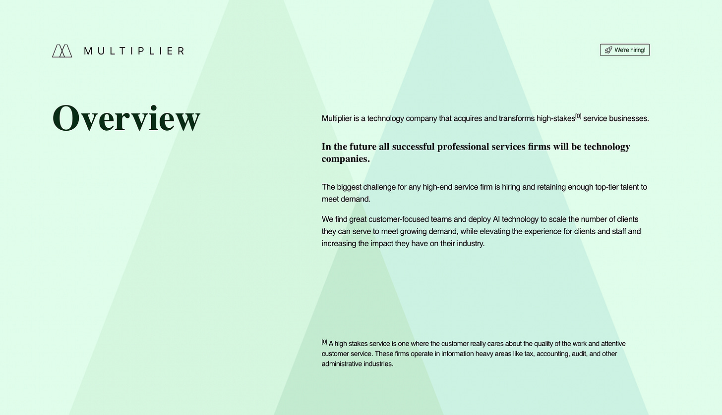 Company Overview: Multiplier Holdings is an AI rollup acquiring small accounting firms and deploying AI to improve margins and scale client growth. Their first acquisition was Citrine International Tax, a 12-person tax accounting firm that provides cross-border accounting services. One of the accountants at Citrine, Emily White claimed that “prior to Multiplier, I sent out 14 tax returns in a 14 hour day. This year I was able to send 24 tax returns in a 10 hour day…”