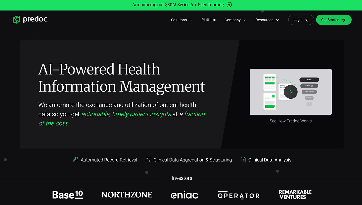 Company Overview: PreDoc is solving one of the most painful problems that doctors have on a frequent basis: chart-chasing, or the manual retrieval of patient records. The company uses AI to automate medical record management and ultimately give physicians an extra day in the week through time savings, allowing practitioners to actually practice medicine.